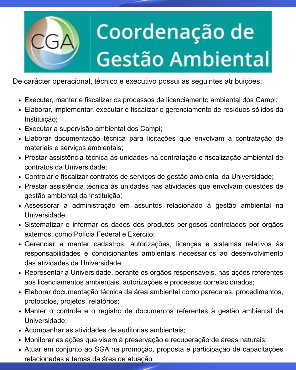 O Sistema de Gestão Ambiental (SGA) é o conjunto de atividades administrativas e operacionais voltadas para o desenvolvimento e implementação da Política Ambiental da Universidade, que integra princípios e objetivos que visam fomentar valores e práticas voltados para a sustentabilidade no ensino, na pesquisa, na extensão e nas atividades administrativas, em um processo de melhoria contínua.