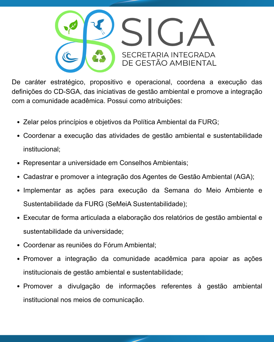 1 . Partindo do nível central da figura acima, estão a Secretaria Integrada de Gestão Ambiental - SIGA (órgão acessor da Reitoria da FURG), e a Coordenação de Gestão Ambiental - CGA (vinculada a SIGA).