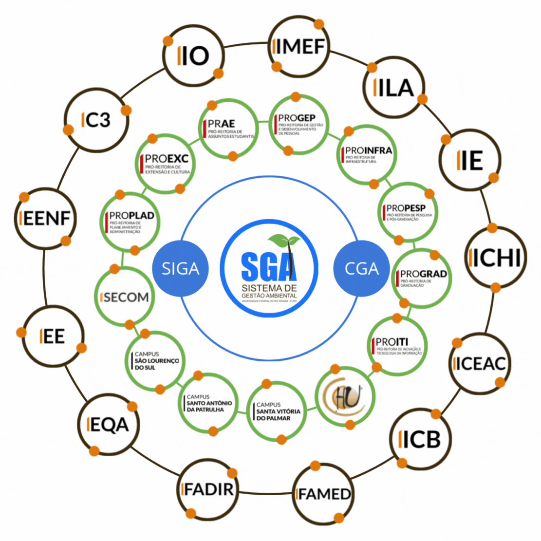 O Sistema de Gestão Ambiental (SGA) da FURG  instituído pela Política Ambiental da FURG (Acesse aqui nossa legislação) é o conjunto de práticas, normas e instâncias que organizam como a universidade planeja, executa e acompanha suas ações voltadas à sustentabilidade. Ele e formado por aproximadamente 80 pessoas de todas as unidades da FURG. A figura abaixo ilustra a capilaridade do SGA. Para melhor entendimento, abaixo detalhamos esta estrutura:
